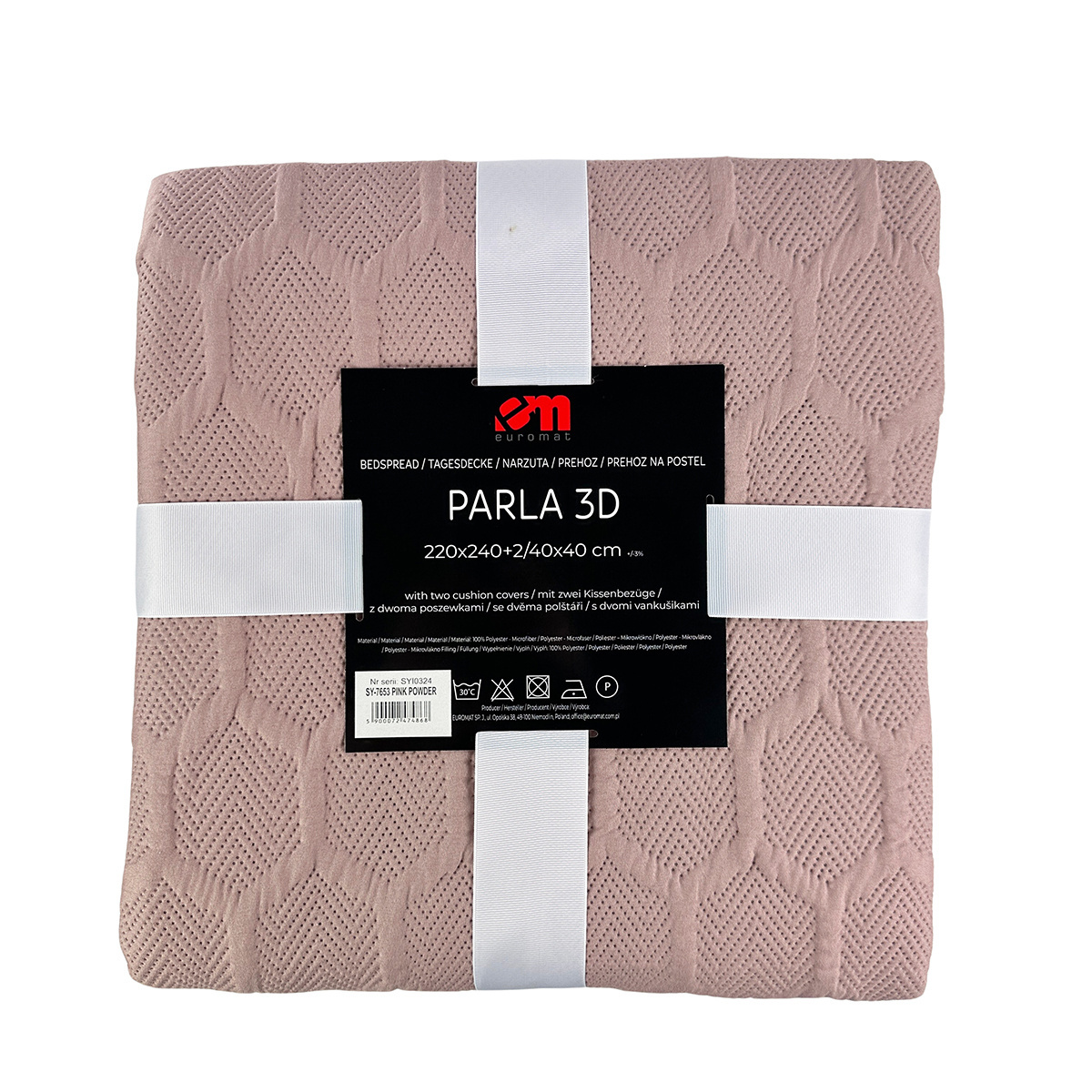 - PARLA 3D bedspreads – double-sided, single-colour, with decorative 3D embossing. Material: 100% matt polyester microfiber with 100% polyester filling. Modern designs. Available also as a set with 2 cushion covers. Made in China.
