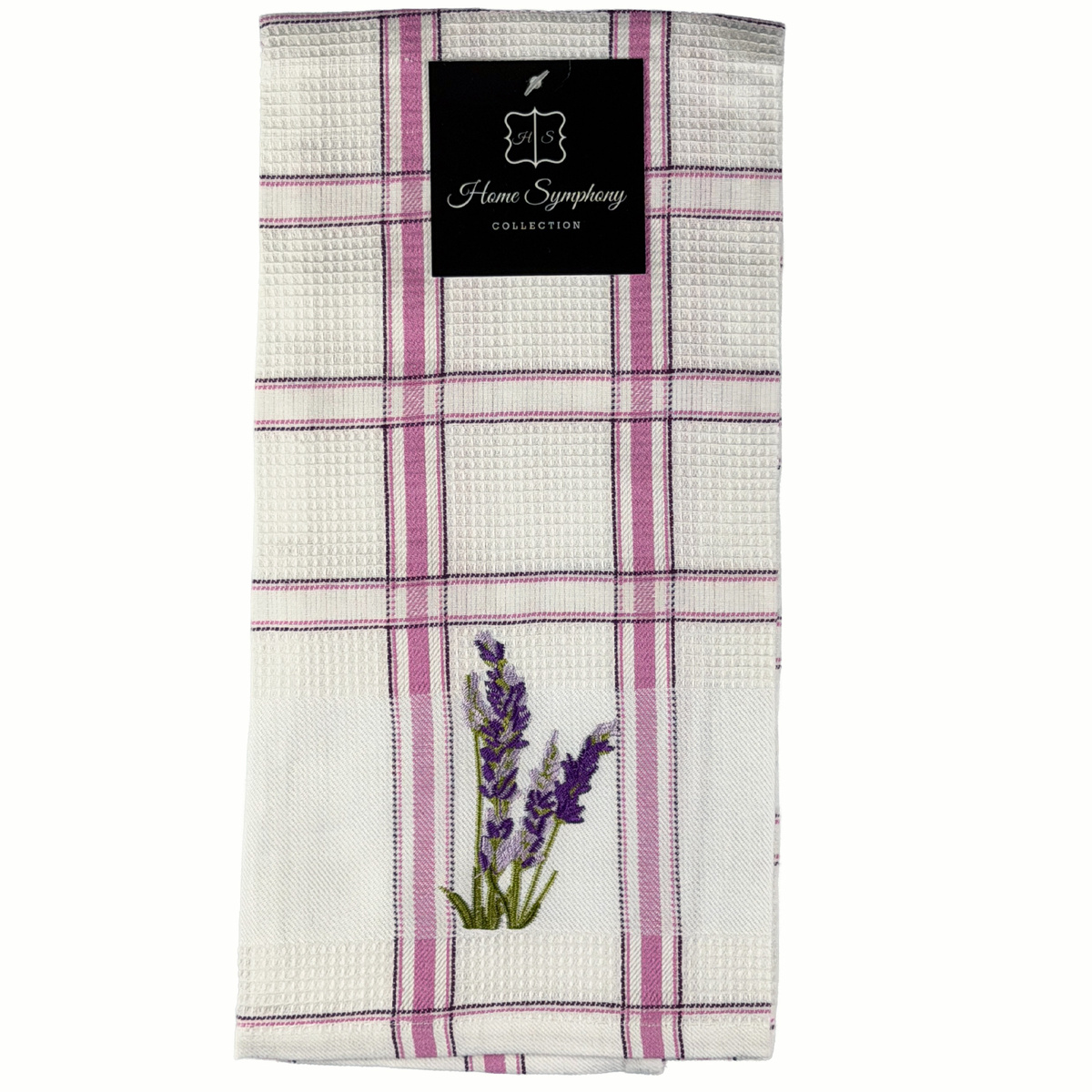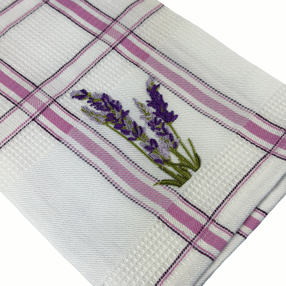 - Kitchen towels LAWENDA. Fabric: 100% cotton, size 45x65cm, weight 220g/m2. White waffle style fabric with coloured woven checked pattern in 3 colours: blue, green and red, with embroided lavender flower. Made in China.