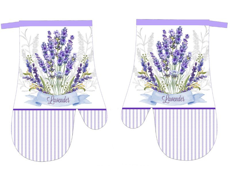 - Kitchen gloves with a magnet LAVENDER II 2 pcs. set, right + left (size 18x27 cm). Material 100% polyester with a print, non-woven filler. A magnet sewn-in. Lavender motif. Model: MT173-02CE. Product has CE certificate. Made in China.