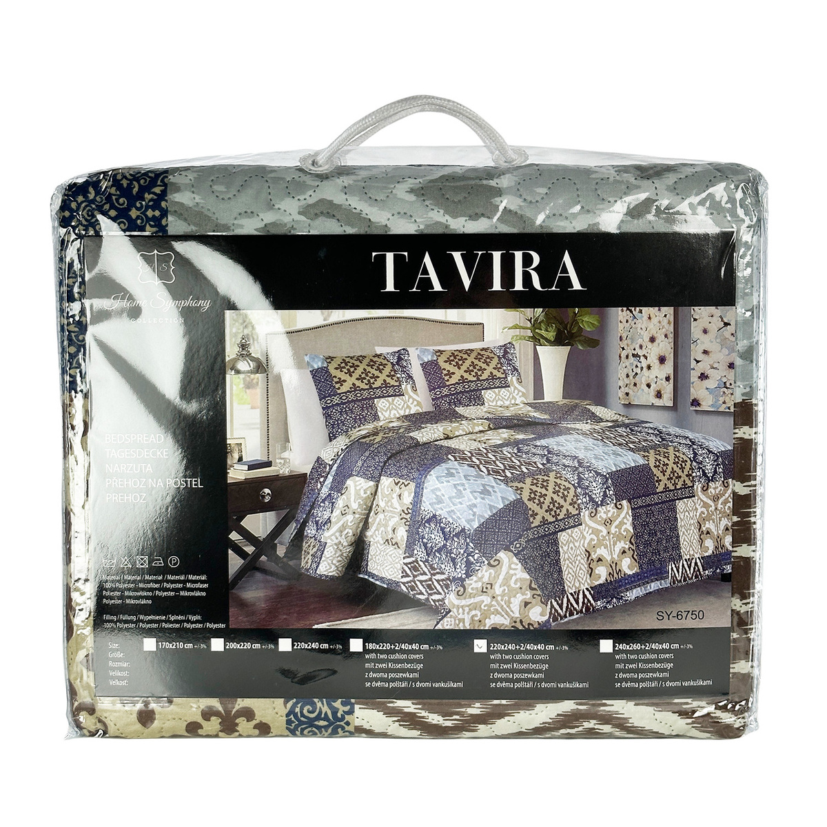 - Bedspreads TAVIRA. Reversible with imprint and decorative embossed pattern. Fabric: 100% polyester microfiber, filling: 100% polyester. Available in many modern designs. 2 cushion covers included. Made in China.