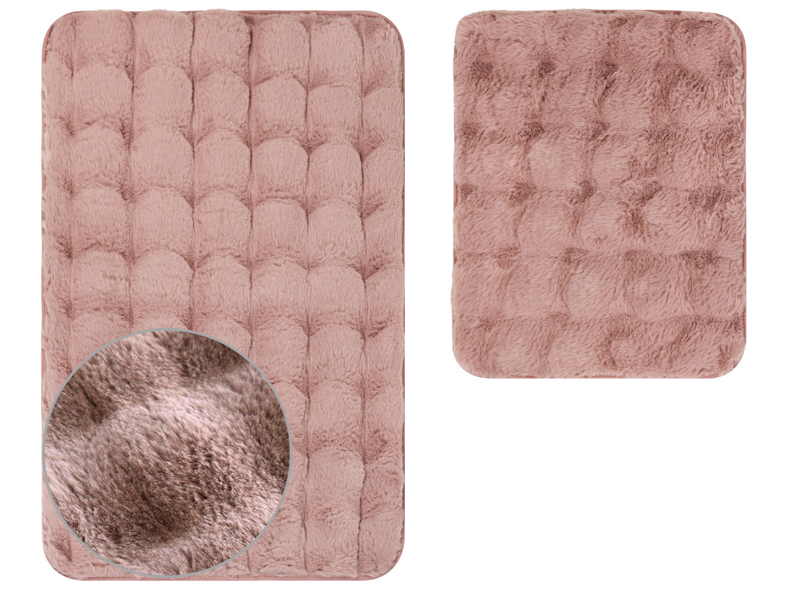 - Bath mats ARUBA – solid with a jacquard pattern, made of long (4 cm), soft polyester fiber, imitating rabbit fur, non-slip backing bath mats. Made in China.