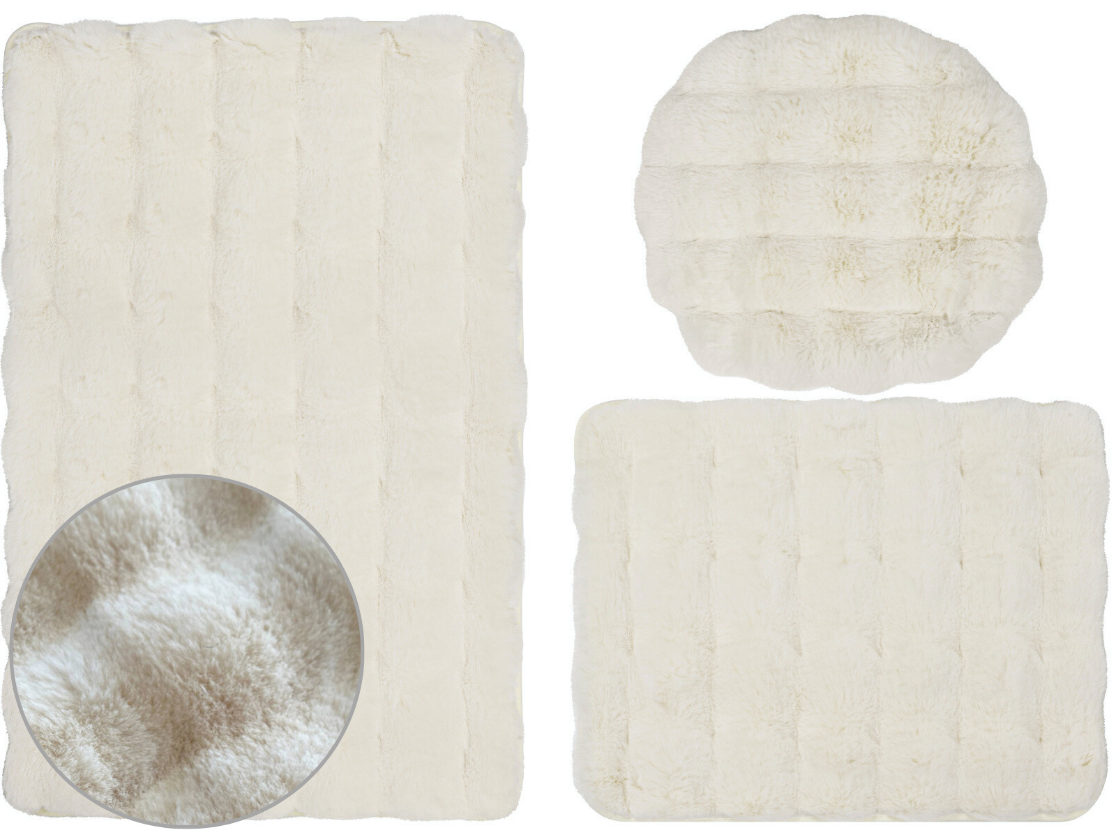 - Bath mats ARUBA – solid with a jacquard pattern, made of long (4 cm), soft polyester fiber, imitating rabbit fur, non-slip backing bath mats. Made in China.