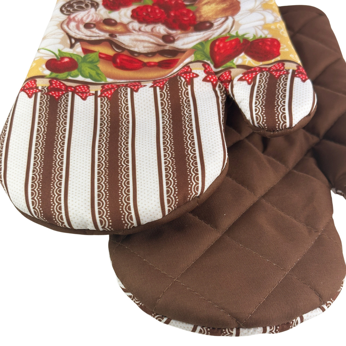 - Kitchen gloves with a magnet SWEETS 2 pcs. set, right + left (size 18x27 cm). Material 100% polyester with a print, non-woven filler. A magnet sewn-in. Kitchen motif. Model: MT173-02CE. Product has CE certificate. Made in China.