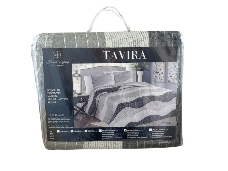 - Bedspreads TAVIRA. Reversible with imprint and decorative embossed pattern. Fabric: 100% polyester microfiber, filling: 100% polyester. Available in many modern designs. 2 cushion covers included. Made in China.