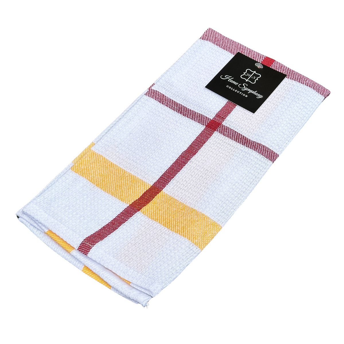- Kitchen towels GRACJA. Fabric: 100% cotton, size 45x65cm, weight 205g/m2. White waffle style fabric with colored woven pattern in 4 colors: black-grey, red-orange, blue, green. Made in China.