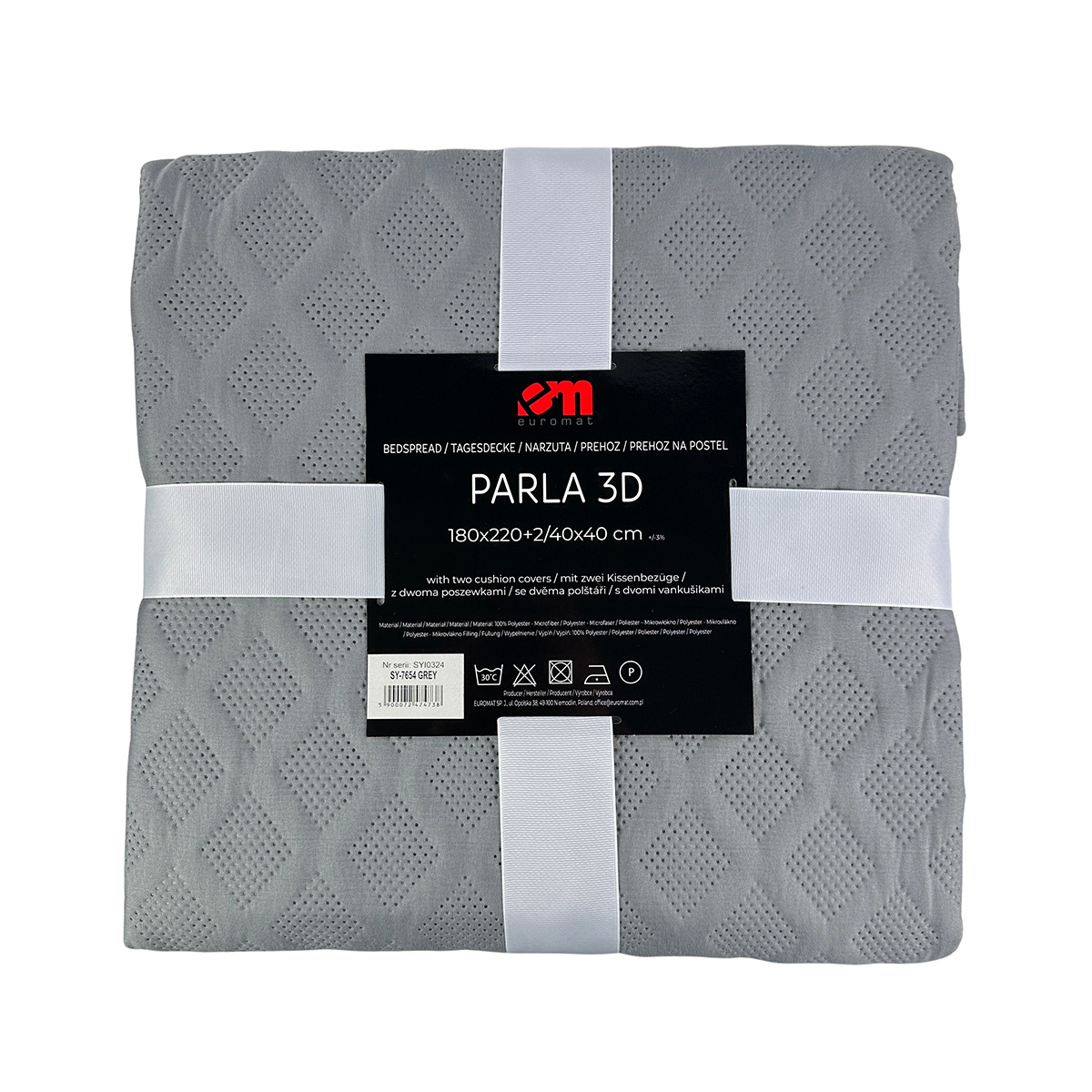 - PARLA 3D bedspreads – double-sided, single-colour, with decorative 3D embossing. Material: 100% matt polyester microfiber with 100% polyester filling. Modern designs. Available also as a set with 2 cushion covers. Made in China.