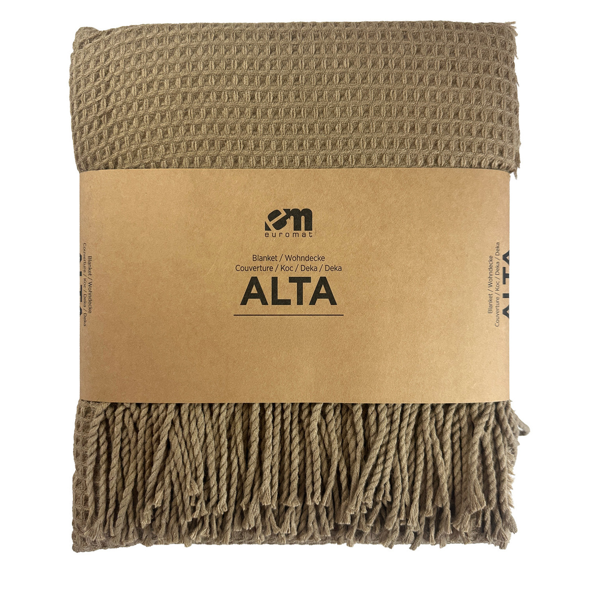 - Blanket ALTA – 100% acrylic, blanket with fringes. Jacquard 3D waffle pattern. Solid, 250gsm. Made in China.